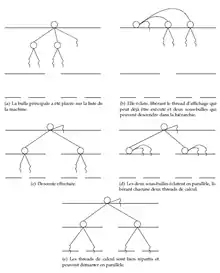 - Le « vol de travail »[14] : Il consiste à trouver des processus à exécuter par un processeur lorsqu'il est inactif. De cette façon, un processeur « vole » le travail car ce travail était préalablement destiné à un autre. Il faut pour cela ajouter des relations père/fils entre les listes de processus, c'est-à-dire connaître pour une liste donnée, celle qui l'a engendrée et celles qu'elle engendrera. L'ordonnanceur cherche d'abord localement puis plus globalement, jusqu’à trouver du travail. Savoir quel « vol » effectuer est un problème algorithmique non trivial : seule une partie de la hiérarchie de bulles devrait être tirée vers le processeur inactif pour que l'ordonnancement soit vraiment efficace. Dans le cas contraire, les charges sur les processeurs ne seraient plus équilibrées.