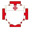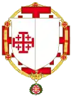 Patriarche grand-prieur | Le patriarche grand-prieur de l'ordre met au chef de ses armes celles de l'ordre, d'argent à la croix de Jérusalem de gueules. Il le timbre du chapeau héraldique de sinoples à 5 rangées de houppes et cordons de même. |