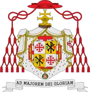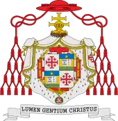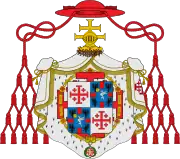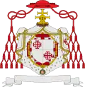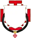 Cardinal grand maître | Le cardinal grand maître écartèle ses armes avec celles de l'ordre, d'argent à la croix de Jérusalem de gueules. Il le timbre du chapeau héraldique de gueules à 5 rangées de houppes et cordons de même. Le tout posé sur un manteau mouvant de la couronne d'épines surmontée du cimier. |