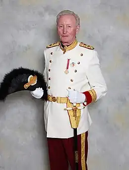 - l'uniforme de « petite cérémonie » est constitué d'un pantalon de drap rouge à galon d'or, et d'une veste en drap blanc ivoire. Les parements (manchettes et col) sont en velours rouge bordeaux accompagnés d'un nombre plus ou moins important de galons dorés, selon le grade. Un ceinturon de cuir recouvert d'un galon doré avec porte-épée, une épée, des bottines vernies et des éperons complètent le tout. La coiffure reste le bicorne.