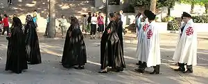 Les dignitaires de l'ordre peuvent porter le manteau chapitral blanc, ample et à grande roue, arrivant jusqu'à terre, avec la croix du Saint-Sépulcre rouge, un col à revers, une grande cordelière de coton d'or fermée par des nœuds coulants.
