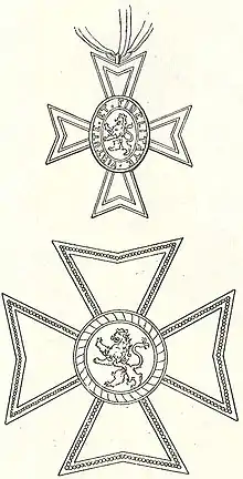 La médaille de l'Ordre, se compose d'une croix de Malte d'or émaillé blanc, au centre de laquelle se trouve un médaillon avec un lion couronné entouré par la devise de l'ordre, Virtuti et Fidelitate.