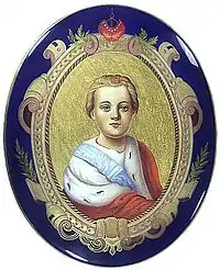 - Une croix, croix de Saint-André, émaillée en bleu, posée sur une aigle bicéphale noire (armes de l'empire de Russie), surmontée d'une couronne impériale formant bélière, avec :
