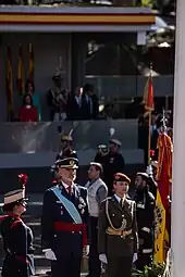 Le roi d'Espagne Felipe VI et la princesse héritière Leonor porteurs des insignes de la Toison d'Or (en pendentif), en 2023 lors de la Fête nationale espagnole.