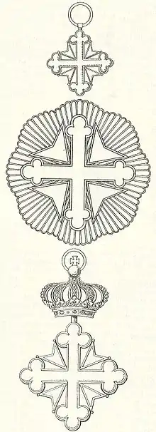 La médaille de l'ordre consiste en une croix mauricienne en émail blanc d'où dépassent quatre bras en émail vert. À partir de la classe des officiers, la médaille était reliée au ruban par une couronne royale en or. La classe des officiers de 1857 à 1868 avait une couronne de laurier en or attachée au ruban.