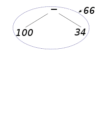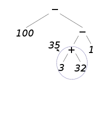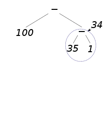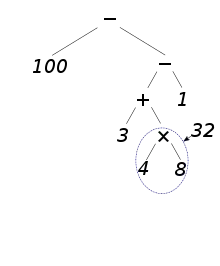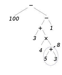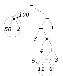 Ainsi, dans l'exemple précédent : 50 × 2 − [ 3 + 4 × (11 − 6 + 3) − 1 ], le dernier calcul à effectuer est une soustraction entre 50 × 2 et 3 + 4 × (11 − 6 + 3) − 1. L'arbre de l'expression est alors la concaténation de l'arbre de 50 × 2 et de l'arbre de 3 + 4 × (11 − 6 + 3) − 1. L'arbre se construit de propre en proche. Le calcul s'effectue ensuite en partant des feuilles et en remontant jusqu'à la racine.
