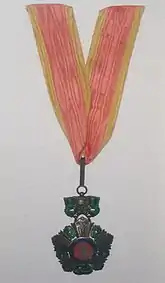 - Chevalier : l'insigne de l'Ordre était porté sur un ruban simple, sur la poitrine à gauche.