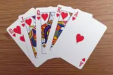 - Poker : la probabilité d'obtenir une quinte flush (autre qu'à l'as) au poker à 52 cartes est de 1,385 × 10−5 (quand on admet les suites blanches) soit une chance à 72 192 contre 1.