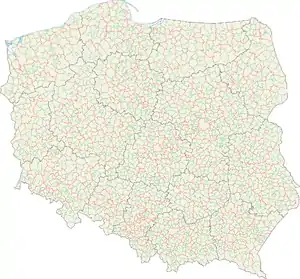 Les gminy (communes) sont généralement subdivisés en plus petites unités appelées osiedle ou dzielnica dans les villes, et sołectwo à la campagne. Cependant ces unités de moindre importance sont subordonnées au statut desgminy.