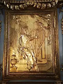 Détail des sculptures au-dessus des claviers de l'orgue.
