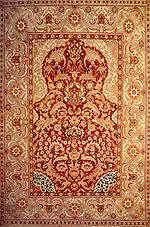 La plus prestigieuse des manufactures européennes de tapis à poils noués était celle de la Savonnerie. Établie en 1615 dans une ancienne usine de savon sur le quai de Chaillot en aval de Paris par Pierre Dupont, qui revenait du Levant et écrit La Stromatourgie, Ou Traité de la fabrication des tapis de Turquie (Paris, 1632), elle a connu son apogée vers 1650-1685[31]. En vertu d’un privilège de dix-huit ans, le monopole a été accordé par Louis XIII en 1627 à Pierre Dupont et à son ancien apprenti Simon Lourdet, fabricants de tapis « à la manière de la Turquie ». Jusqu’à 1768, les « tapis de la Savonnerie » sont restés la propriété exclusive de la Couronne et ont compté parmi les plus magnifiques des cadeaux diplomatiques français.