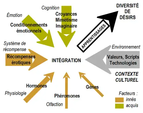 Ainsi, en raison de l'altération de l'olfaction, les phéromones sexuelles deviennent secondaires. Les processus principaux de l'orientation sexuelle devenant secondaires, d'autres facteurs exercent une influence plus significative : le vécu affectif, les attentes sociales, la cognition, l'environnement culturel… En particulier, en raison du développement considérable du néocortex humain, la cognition devient un facteur majeur (influence des conditionnements, de la mémoire et des expériences passées, de l'imagination et des fantasmes, des attentes personnelles, des attitudes et des valeurs sexuelles…)[37].