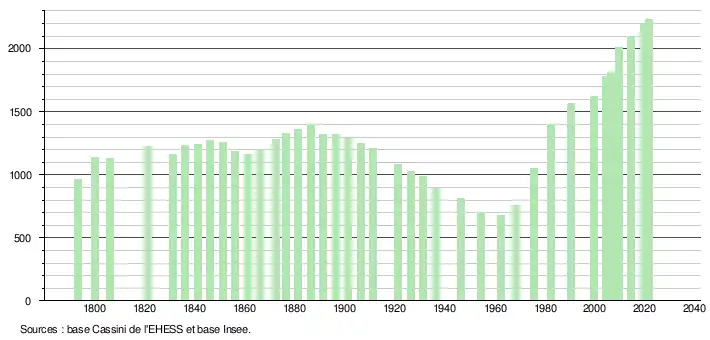L'évolution du nombre d'habitants est connue à travers les recensements de la population effectués dans la commune depuis 1793. Pour les communes de moins de 10 000 habitants, une enquête de recensement portant sur toute la population est réalisée tous les cinq ans, les populations légales des années intermédiaires étant quant à elles estimées par interpolation ou extrapolation[16]. Pour la commune, le premier recensement exhaustif entrant dans le cadre du nouveau dispositif a été réalisé en 2004[17].