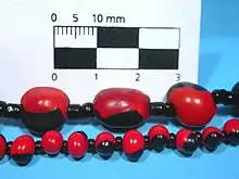 Les graines d’Ormosia coccinea sont très utilisées dans le bassin amazonien pour l'artisanat amérindien (ex : Wayanas) : colliers, bracelets et autres bijoux[4]... Au Guyana, elles sont utilisées chez les enfants Arawak pour jouer et parfois pour leur apprendre à compter. Elles servent de perles ou sont conservées sur soi comme porte-bonheur[10].