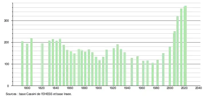 L'évolution du nombre d'habitants est connue à travers les recensements de la population effectués dans la commune depuis 1793. Pour les communes de moins de 10 000 habitants, une enquête de recensement portant sur toute la population est réalisée tous les cinq ans, les populations légales des années intermédiaires étant quant à elles estimées par interpolation ou extrapolation[19]. Pour la commune, le premier recensement exhaustif entrant dans le cadre du nouveau dispositif a été réalisé en 2005[20].
