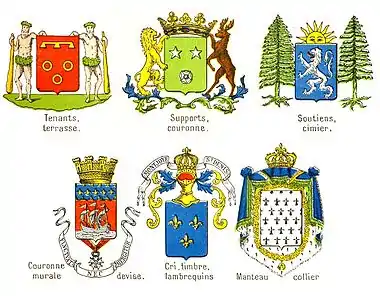 L'écu peut être notamment surmonté d'une couronne ou d'un heaume, entouré de colliers des ordres auxquels appartient le titulaire des armes, maintenu par des figures, appelées tenants lorsqu'il s'agit d'êtres humains, supports quand il s'agit d'animaux et soutiens quand il s'agit d'objets inanimés. L'ensemble peut reposer sur une terrasse ou un socle.