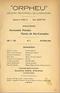 Fin parait le premier numéro de la revue "Orpheu, propriété de la firme Orpheu, Lda., destinée au Portugal et Brésil", avec 83 pages, imprimées sur du papier de qualité, avec comme directeurs de publication Luís de Montalvôr (pour le Portugal) et Ronald de Carvalho (pour le Brésil), et comme éditeur le jeune António Ferro. Entre autres, la revue comptait comme collaborateurs Fernando Pessoa, Mário de Sá-Carneiro et José de Almada Negreiros. Dans l'Introduction du no 1, Luiz de Montalvôr présentait l'orientation esthétique de la revue comme « un exil de tempéraments de l'art » basé sur un « principe aristocratique » de l'« harmonie esthétique », avec un « désir de bon goût et de propos raffinés sur l'art ». Plus qu'une revue littéraire moderne et plus qu'un objet d'art, Orpheu se veut un acte créateur et même l'art en acte. Calligrammes, vers libres, détournement de la ponctuation, éclectisme de l'orthographe et des styles, néologismes, archaïsmes, anachronismes[1].