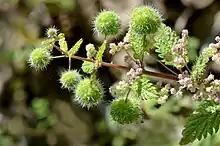 Les fleurs femelles forment, par accolement les unes aux autres, des glomérules ayant jusqu'à 1 cm de diamètre, situées à l'extrémité d'un long pédoncule. Chaque fleur est formée de sépales verts, hispides, entourant un gros ovaire.