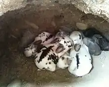 À l'état sauvage, ces lapins creusent des terriers et préfèrent les zones plutôt sèches et au sol meuble et profond[19]. Le terrier est creusé de préférence sur un talus, en terrain sec ; son ouverture varie de 10 à 50 cm. Suivant la densité de la population locale, il est relié ou non aux autres terriers par des galeries. Un réseau de terriers est appelé une garenne. Le lapin s'en éloigne généralement de quelques centaines de mètres pour chercher sa nourriture.