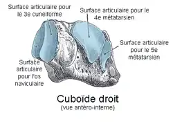 La face médiale présente deux facettes articulaires : une plane et ovalaire à sa partie moyenne qui s'articule avec le cunéiforme latéral et en arrière de celle-ci une facette plus petite pour l'os naviculaire.