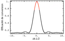 Ce que montre cette formule et la figure ci-contre, c'est que l'intensité générée peut rester importante même avec un faible Δk L : l'accord de phase n'est pas une condition stricte. Autrement dit, le processus de conversion de la pompe vers le signal et le complémentaire restera efficace :