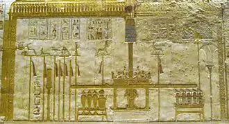 | Attribut(s) | Barbe postiche, sceptre Héqa, Nekhekh, couronne Atef, pilier Djed | |||