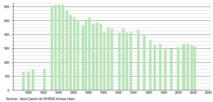 L'évolution du nombre d'habitants est connue à travers les recensements de la population effectués dans la commune depuis 1793. Pour les communes de moins de 10 000 habitants, une enquête de recensement portant sur toute la population est réalisée tous les cinq ans, les populations légales des années intermédiaires étant quant à elles estimées par interpolation ou extrapolation[22]. Pour la commune, le premier recensement exhaustif entrant dans le cadre du nouveau dispositif a été réalisé en 2007[23].
