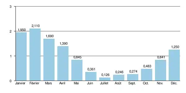 Le débit maximal instantané relevé a été de 78,10 m3/s le pour une hauteur maximale de 252 cm soit 2,52 m, et avec un débit journalier maximal de 21,80 m3/s le [2].