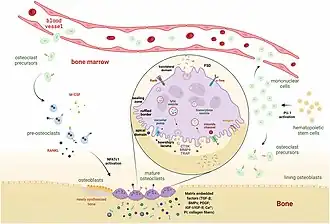 L' ostéoclaste est une cellule géante multinucléée osseuse d’un diamètre de 20 à 100 μm d'origine hématopoïétique, qui se forment à la suite de la fusion de macrophage entraînés par la production de deux cytokines essentielles dérivées du micro-environnement médullaire : le facteur de stimulation des colonies de macrophages (M-CSF acronyme de macrophage colony-stimulating factor) et l'activateur des récepteurs nucléaires. ligand du facteur kappa B (RANKL) [1],[2].