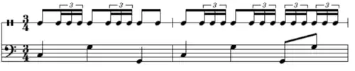 Le motif rythmique principal du Boléro de Ravel (en haut sur l'image ci-contre), est donné par la caisse claire sans aucune variation durant toute l'œuvre, sauf dans les deux dernières mesures où il s'interrompt brutalement. Le motif rythmique secondaire (en bas, ici simplifié sur une seule portée d'après Serge Gut[9]) joue également un rôle tonal en martelant une double pédale de tonique (do) - dominante (sol) tout au long du morceau.