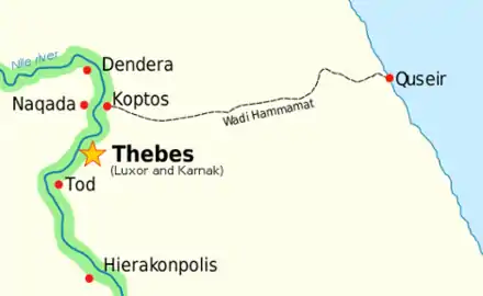 Le ouadi Hammamat est une voie essentielle dès l'Ancien Empire. Durant la Première Période intermédiaire, son contrôle fait l'objet d'un conflit entre les villes de Thèbes et de Coptos, qui tourne à l'avantage de la première, dirigée par Antef l'Ancien[3].