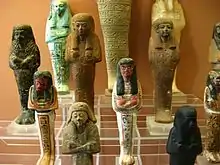 Ces statuettes représentent les serviteurs funéraires qui devaient répondre[note 1] à l’appel d’Osiris et remplacer le mort dans les travaux des champs de l’au-delà.