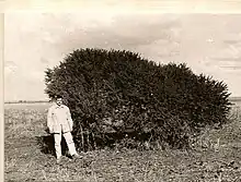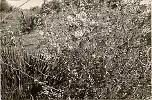Retama monosperma (L.) Lam. ou genêt blanc (rtem en arabe) est un arbuste qui a été larement exploité pour son bois par les charbonniers. On peut en trouver çà et là. Un exemplaire (voir photo) a pu se développer tranquillement au sommet de la Koudiat El Gaâda. En comparaison avec le spécimen arborescent, un spécimen buissonnant (en Espagne).