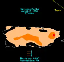 La pluviométrie maximale selon l'image de droite fut de 175 mm à Pico del Este, mais il eut un rapport de 208 mm le long du Rio Icacos à Naguabo tout près[6]. Ailleurs les accumulations vont de 25 à 100 mm dont 40 mm à l'aéroport international Luis-Muñoz-Marín[3]. Les rapports de vents soutenus à la base navale de Roosevelt Roads le 8 juillet furent de 71 km/h. Bien que de fortes pluies se soient produites, aucune inondation généralisée ou importante n'a été signalée. Cependant, plusieurs cas de rivières gonflées ont provoqué quelques inondations mineures dans les basses terres et dans les centres urbains.