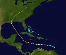 L'ouragan fut signalé près des petites Antilles entre Puerto Rico et l'Amérique du sud. Dans les Caraïbes, il se renforça en un ouragan de catégorie 4 avec des vents à 230 km/h le . Alors qu'il s'approchait des côtes américaines, une alerte fut émise de Floride jusqu'en Louisiane. Il toucha la côte non loin de Grand Isle en Louisiane le , redescendant alors en fort ouragan de catégorie 3 avec des vents de 200 km/h. Ensuite, il fit route vers le nord-est en faiblissant en tempête tropicale alors qu'il traversait le Mississippi, l'Alabama et le Tennessee.