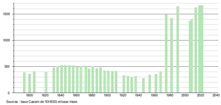 L'évolution du nombre d'habitants est connue à travers les recensements de la population effectués dans la commune depuis 1793. Pour les communes de moins de 10 000 habitants, une enquête de recensement portant sur toute la population est réalisée tous les cinq ans, les populations légales des années intermédiaires étant quant à elles estimées par interpolation ou extrapolation[39]. Pour la commune, le premier recensement exhaustif entrant dans le cadre du nouveau dispositif a été réalisé en 2008[40].