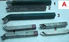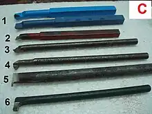 L’outil proprement dit, est de petite dimension, en acier rapide, souvent taillé dans une chute de foret cassé ou un foret à centrer, monté dans un logement percé en bout d’une tige métallique et fixé par une vis pointeau. Utilisé pour les alésages longs demandant une bonne rigidité de l’outil. La partie active peut avoir toutes les formes désirées (filetage, rainurage, alésage, dressage...) (D).