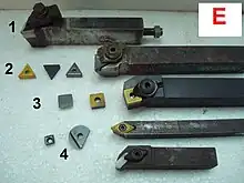 Les plaquettes et porte-outils de tournage sont normalisées par la norme ISO 1832:2017 « plaquettes amovibles pour outils coupants »[2]. Les caractéristiques et dimensions importantes de la plaquette sont définies par un code, devenant le nom de la plaquette. Certaines parties du code de la plaquette se rapportent à celui du porte-plaquette dans lequel la plaquette peut être montée, permettant la vérification rapide de compatibilité[3].