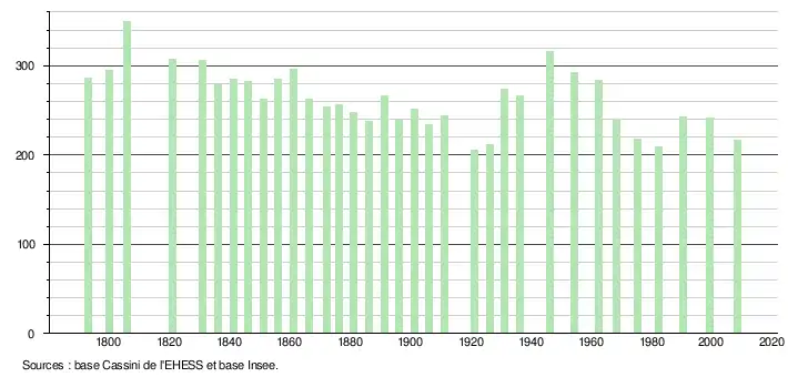 L'évolution du nombre d'habitants est connue à travers les recensements de la population effectués dans la commune depuis 1793. À partir du , les populations légales des communes sont publiées annuellement dans le cadre d'un recensement qui repose désormais sur une collecte d'information annuelle, concernant successivement tous les territoires communaux au cours d'une période de cinq ans. Pour les communes de moins de 10 000 habitants, une enquête de recensement portant sur toute la population est réalisée tous les cinq ans, les populations légales des années intermédiaires étant quant à elles estimées par interpolation ou extrapolation[10]. Pour la commune, le premier recensement exhaustif entrant dans le cadre du nouveau dispositif a été réalisé en 2008[11],[Note 1].