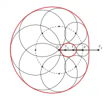 Chaque cercle (ΓM) est tangent à l'ovale en deux points TM et T'M toujours alignés avec le troisième foyer de l'ovale[17].