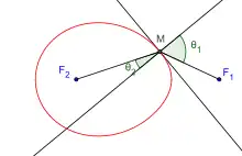 Ainsi, si on appelle θ1 l'angle que fait F1M avec la normale et θ2 l'angle que fait F2M avec la normale, on a l'égalité : .