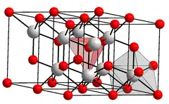 L'oxyde de lanthane est un composé chimique de formule La2O3. C'est le sesquioxyde du lanthane, une terre rare. Il se présente sous la forme d'une poudre blanche cristallisée dans le système trigonal et le groupe d'espace P3m1 (no 164)[4]. Les cations de lanthane La3+ sont coordonnés à sept anions oxyde O2− selon une géométrie octaédrique, le septième anion se trouvant au-dessus de l'une des faces de l'octaèdre[5]. C'est un semiconducteur de type p avec une bande interdite de 5,8 eV[6]. Insoluble dans l'eau, il est soluble dans les acides dilués. Hygroscopique, il absorbe progressivement l'humidité de l'air pour donner de l'hydroxyde de lanthane La(OH)3. Sa résistivité à température ambiante est de l'ordre de 10 kΩ cm, valeur qui décroît lorsque la température croît. Sa permittivité vaut ε = 27[7].