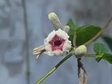 Les fleurs sont regroupées en panicules. Elles sont tubulaires, blanches, avec un cœur poilu, rose foncé ou pourpre. Leur odeur est très forte[1].