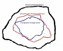 La zone de péage urbain de Londres est plus petite en superficie que la zone comprise à l'intérieur de l'Enceinte des fermiers généraux de Paris (c'est-à-dire la zone comprise entre les lignes 2 et 6 du métro parisien).