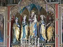 Saint Pélage à gauche, une des sculptures en bois du maître-autel (vers 1471) de l'église Sankt Pelagius à Weitnau en Bavière.