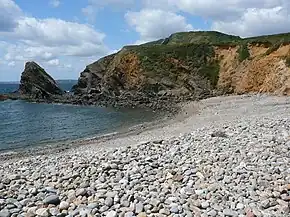 - Au cours de l'interglaciaire actuel, l'Holocène, le réchauffement climatique et la fonte des inlandsis continentaux entraînent un relèvement progressif du niveau de la mer jusqu'au niveau présent il y a environ 2 000 ans. Lors de cette transgression marine, les vagues érodent les coulées périglaciaires qui avaient fossilisé les versants : elles déblayent très facilement la matrice non consolidée et laissent les éléments grossiers (les gélifracts) au pied des falaises. Le polissage par le sable et les petits cailloux marins émousse ces éléments en galets et blocs arrondis. Les galets sont généralement roulés par la mer, par le ressac ou le déferlement des vagues et parfois transportés sur de grandes distances pour venir s'accumuler à la base des versants, des ressauts topographiques ou des appointements (flèche littorale). Les blocs restent généralement au pied des falaises ou sur le littoral rocheux. Ainsi, ce n'est pas l'érosion marine qui a fourni ce grand nombre de matériaux de dimensions variées, mais l'érosion périglaciaire. Cf (en) André Guilcher, Jean-Claude Bodéré, Bernard Hallegouët, « Coastal evolution in western, southestern and northern Brittany as a regional test of impact of sea level rise », Journal of Coastal Research, no 9, , p. 67-90