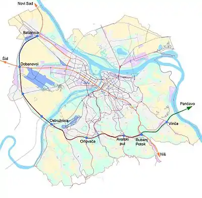 Route Régionale 474 : Belgrade-Centre Route Régionale 154 : Bubanj Potok, Leštane Autoroute A9 (en projet) : Pančevo, Vršac, Bucarest ( |