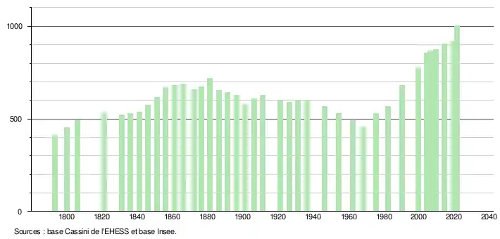 L'évolution du nombre d'habitants est connue à travers les recensements de la population effectués dans la commune depuis 1793. Pour les communes de moins de 10 000 habitants, une enquête de recensement portant sur toute la population est réalisée tous les cinq ans, les populations légales des années intermédiaires étant quant à elles estimées par interpolation ou extrapolation[19]. Pour la commune, le premier recensement exhaustif entrant dans le cadre du nouveau dispositif a été réalisé en 2004[20].
