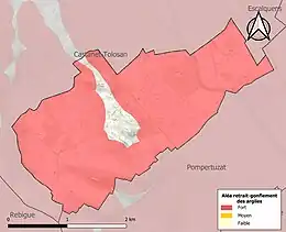 Le retrait-gonflement des sols argileux est susceptible d'engendrer des dommages importants aux bâtiments en cas d’alternance de périodes de sécheresse et de pluie. 93,3 % de la superficie communale est en aléa moyen ou fort (88,8 % au niveau départemental et 48,5 % au niveau national). Sur les 720 bâtiments dénombrés sur la commune en 2019, 616 sont en aléa moyen ou fort, soit 86 %, à comparer aux 98 % au niveau départemental et 54 % au niveau national. Une cartographie de l'exposition du territoire national au retrait gonflement des sols argileux est disponible sur le site du BRGM[24],[Carte 3].