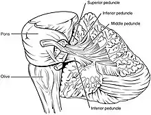 Les pédoncules cérébelleux relient le cervelet au tronc cérébral[1]. Il y a six pédoncules cérébelleux en total, trois à chaque côté :